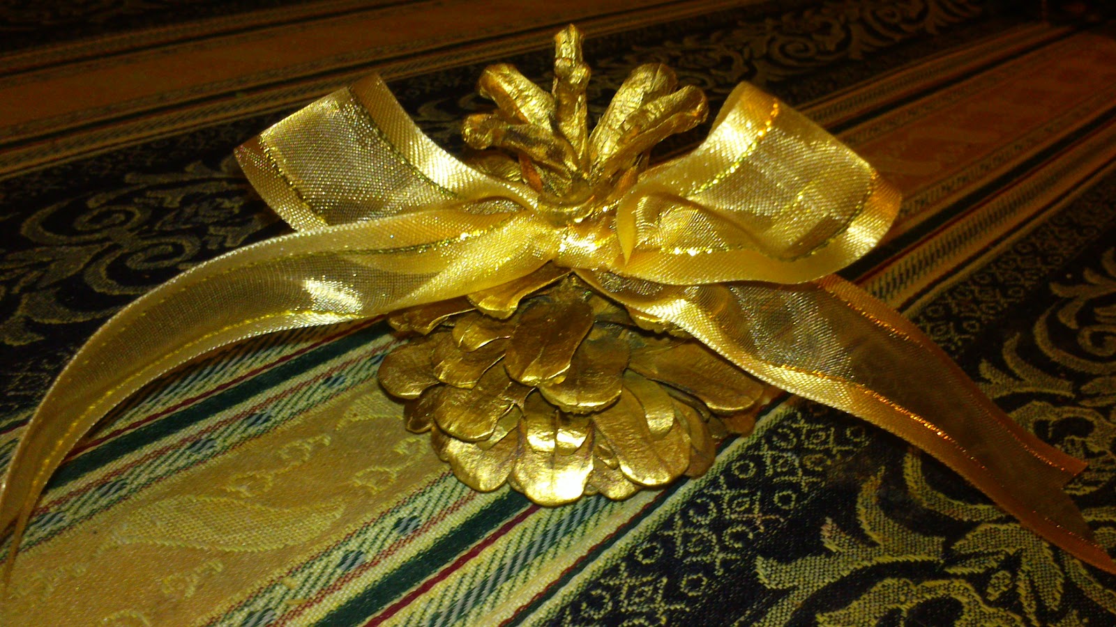 After the paint dried, I tied each pinecone with some matching gold ribbon that was left over from my wedding pew decorations (7 years ago!!!). Then, I let the decorating instinct kick in.